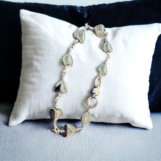 Argentium Silver Wire Wrapped Bracelet with 9 Heart Hematite
