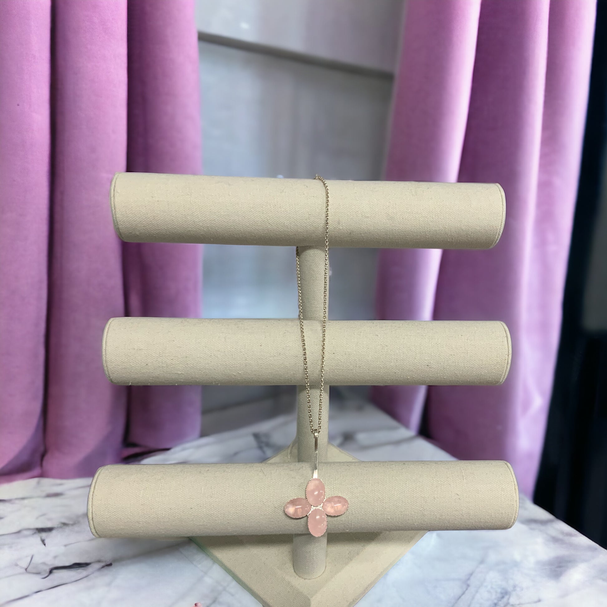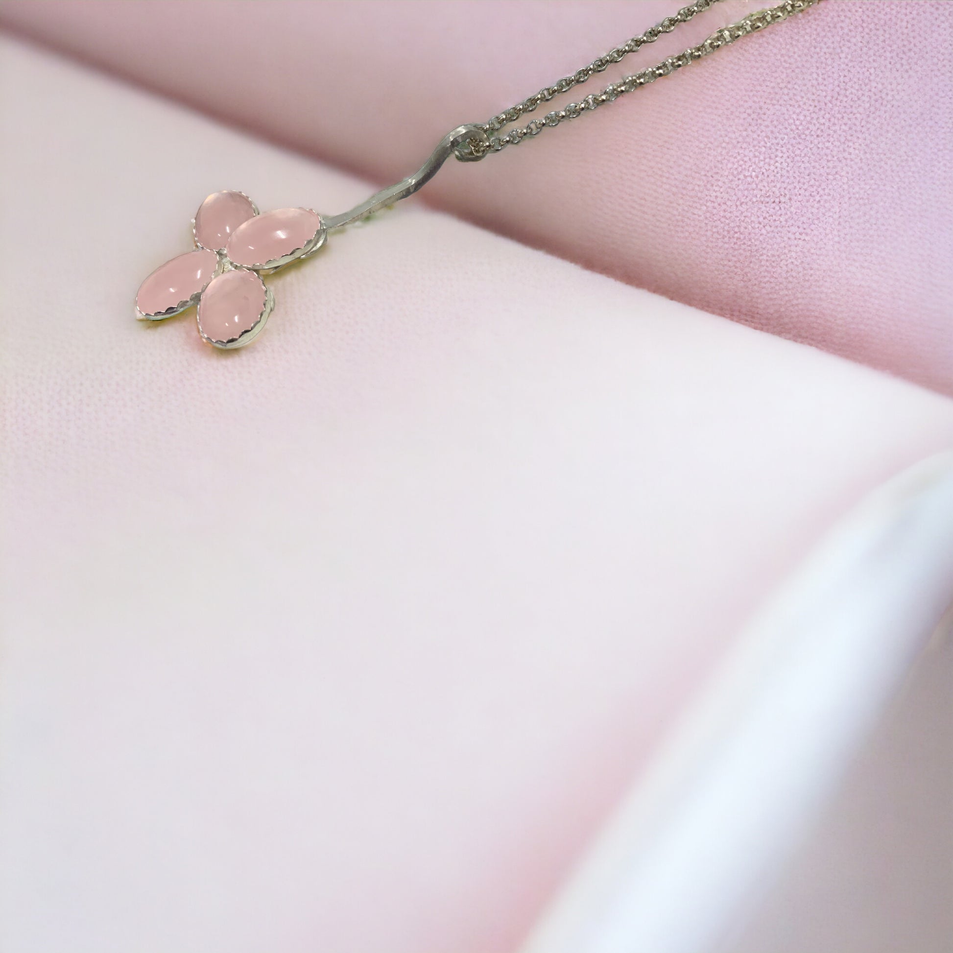 Argentium Silver, Beautiful Rose quartz 4 petal flower, handmade. Comes with 16” Belcher chain.